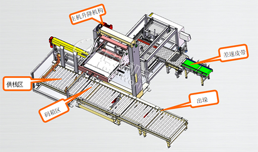 尼為PZ系列碼垛機(jī)用于食品飲料、化工行業(yè)等;適用于各種紙箱、塑箱、膜包及桶類等多種類型包裝件的堆疊,設(shè)備主機(jī)分為差速皮帶、轉(zhuǎn)向機(jī)構(gòu)、排箱區(qū)、碼箱區(qū)、主體升降機(jī)構(gòu)、出垛滾筒等部分組成。