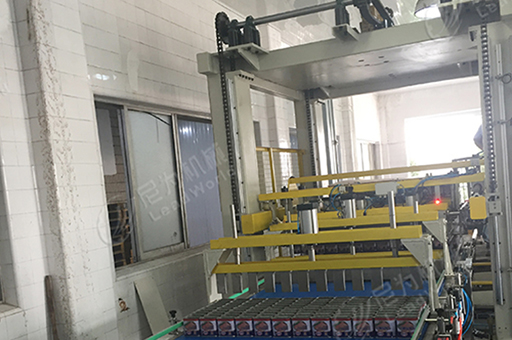 1、自動碼垛:罐頭通過鏈道堆積到輸送線上,開動機器,罐頭被吸起并放到指定的位置上,重復相同的動作,直至將罐頭碼成整垛由叉車叉出。