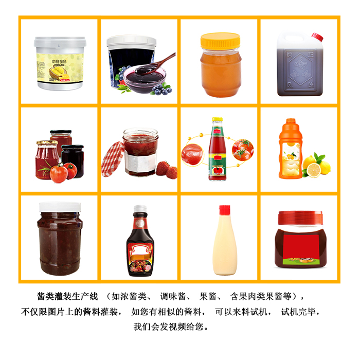 醬料灌裝機,整機采用304不銹鋼,造型大方、美觀;控制系統采用進口電器組件,操作簡單、方便;該醬料灌裝機還可灌裝液體、濃醬類物料,如油類、果汁、果醬等;可用于各種玻璃瓶、塑料瓶、PET罐等。