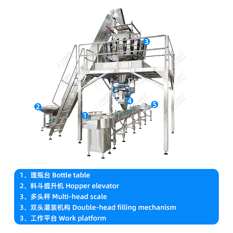 多頭秤灌裝機尼為機械顆粒鹽多頭秤灌裝機,是一款針對顆粒鹽物料特性研發的自動固型灌裝設備。該設備可全程自動化完成顆粒鹽的自動計量、定量送料、精準裝罐、成品輸送等全套包裝流程,無需人工過多干預,大幅提升生產線自動化水平。機身整體采用食品級SUS304不銹鋼打造,不僅外觀美觀大方,更能滿足鹽業生產要求,確保顆粒鹽在包裝過程中不受污染,設備制造精良、操作便捷、運行穩定,是鹽業規模化生產的理想選擇。